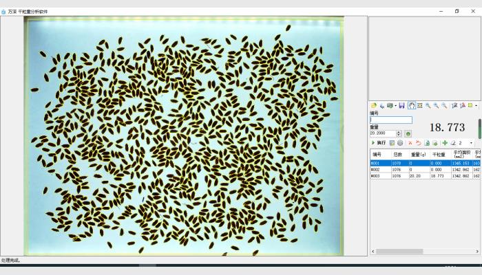 4、將種粒散放在背光板上的成像盤中拍照計(jì)數(shù),再將種粒倒入收納小盒放到帶RS232通訊線的電子天平上,1秒鐘穩(wěn)定后,即將重量數(shù)據(jù)送至電腦中分析系統(tǒng)對應(yīng)的重量欄,算出該樣品種粒的千粒重值和平均粒形值。千粒重分析速度:1200~20000粒/分鐘。