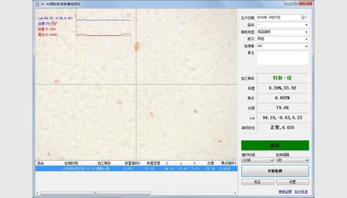 1、自動測定小麥粉的粉色(L、a、b表示)、麩星面積占比(試樣表面麩星面積與試樣表面積的比值%)、麩星密度(每cm2麩星個數(shù))、最大麩星面積(mm2)、黑點面積占比(試樣表面黑點面積與試樣表面積的比值%)、白度(藍光白度)。
