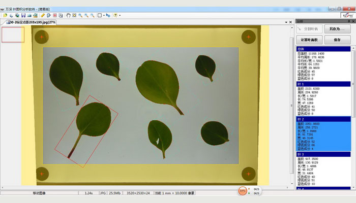 3、可分析小至1mm ^2的葉片,分析誤差<0.5%、測量中的分析時間<2秒,自動獨立標記各葉片并可保存圖,分析結果可輸出至Excel表。