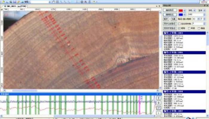 (1)可自動(dòng)判讀年輪數(shù)、各年輪平均寬度、早材及晚材寬度、各年輪切向角度和面積、可自動(dòng)劃分出年輪邊界、早材邊界、晚材邊界,以及識別出很窄的樹輪??山换h除偽年輪、插入斷年輪,