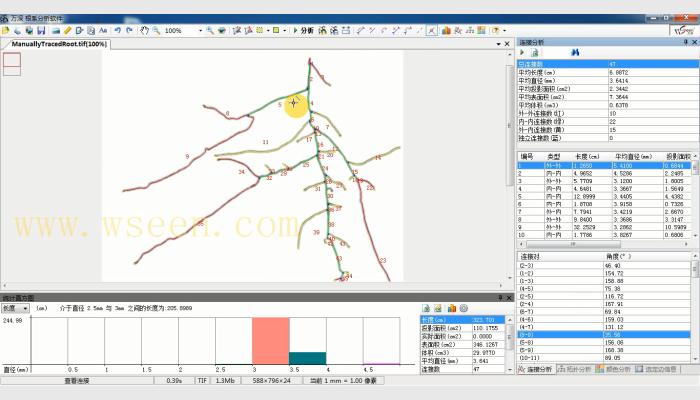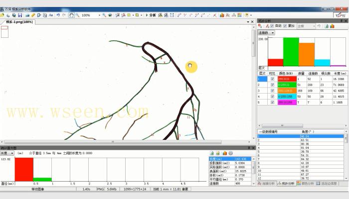 (12)能進行根系的拓撲分析,自動確定根的連接數(shù)、關(guān)系角等,還能單獨地自動分析主根或任意一支側(cè)根的長度和分叉數(shù)等,可單獨顯示標記根系的任意直徑段相應(yīng)各參數(shù)(分檔數(shù)、檔直徑范圍任意可改,可不等間距地自定義),并能進行根的分叉裁剪、合并、連接等修正,修正操作能回退,以快速獲得100%正確的結(jié)果。