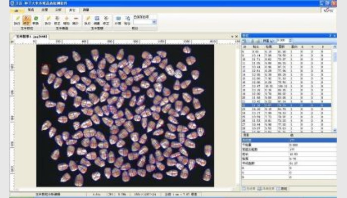 (3)★能大批量自動分析成像后的種粒圖片,自動測出籽粒數(shù)、各籽粒的粒形參數(shù)(長、寬、長寬比、面積、等效直徑、周長等),以及其平均值,能精準(zhǔn)顯示種粒外接矩形,可自動排序輸出,及可輸出粒徑分布圖表。